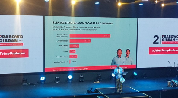 Hasil survei tersebut dipamerkan Ridwan Kamil dalam acara pengukuhan struktur TKD Jawa Barat, Sabtu (25/11/2023) malam. Kegiatan itu dihadiri oleh Prabowo Subianto.